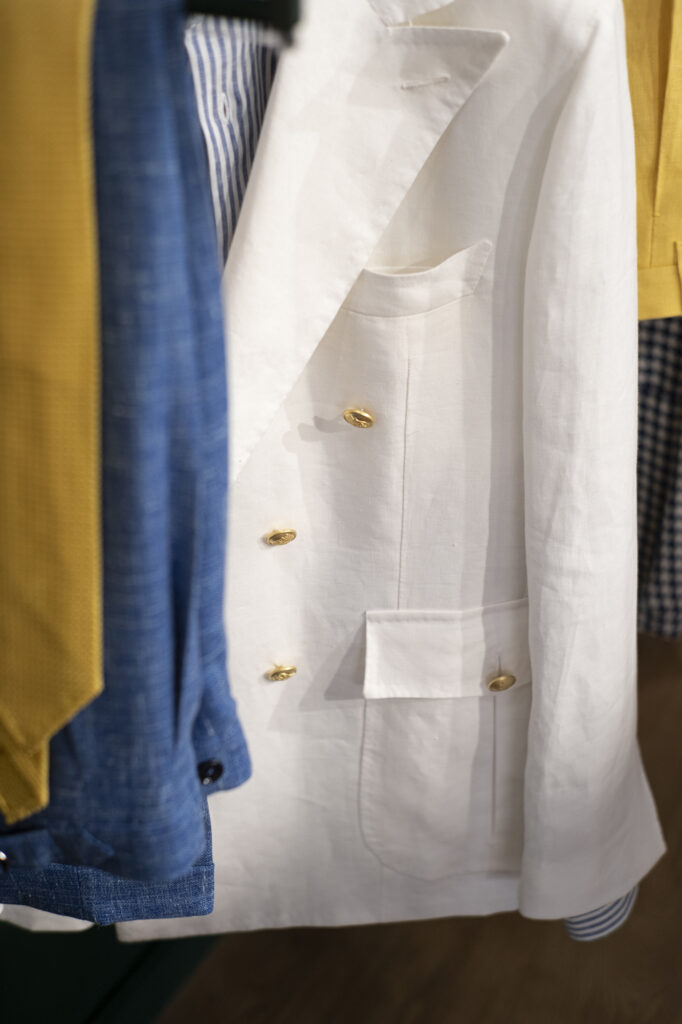 Every detail reflects our heritage: hand stitching, natural buttons, and clean functional elements such as patch pockets. These are not decorative features, but expressions of our tailoring identity and craftsmanship.
